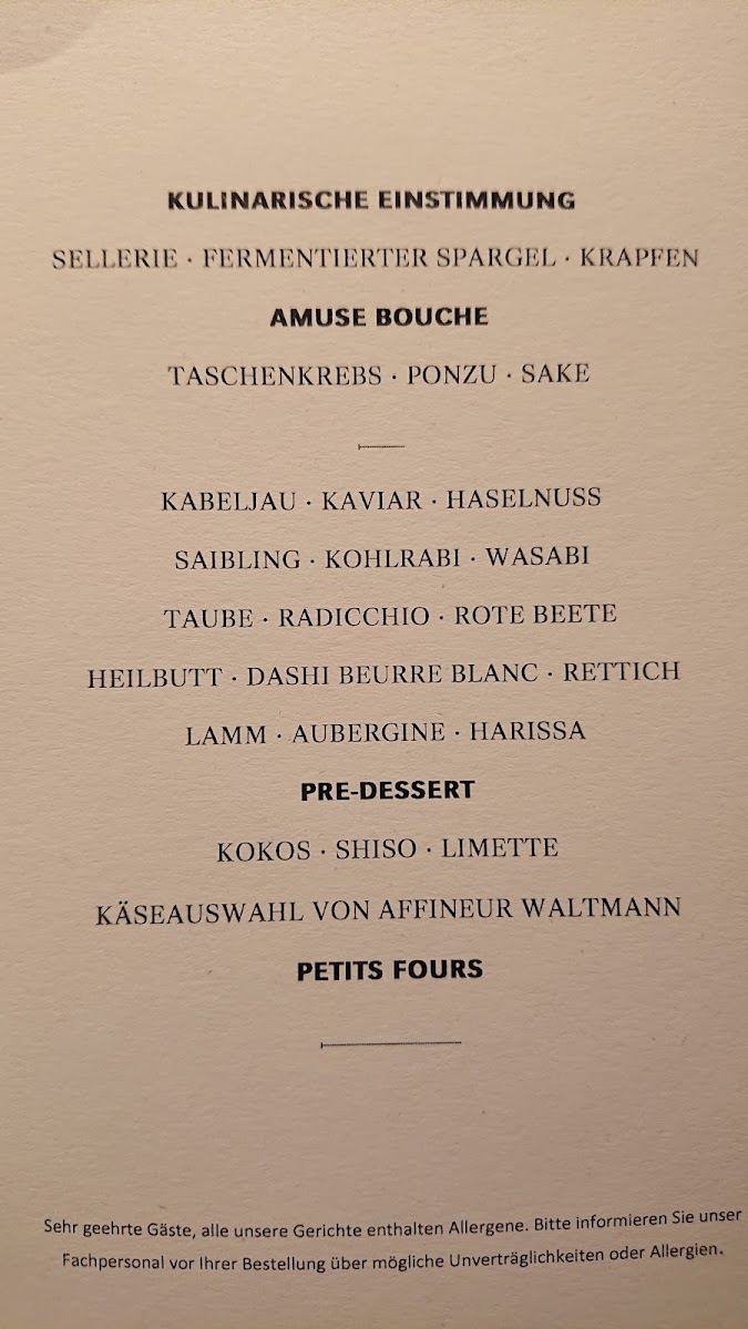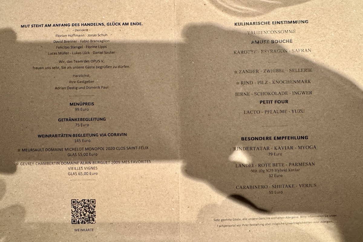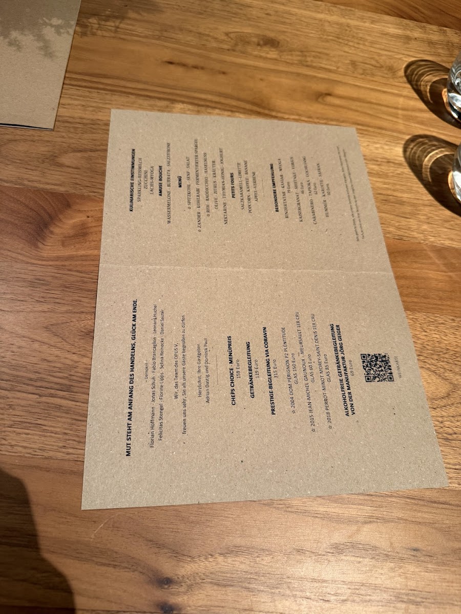 Opus V offers a refined and innovative menu that showcases the skillful blending of flavors and textures, providing a memorable culinary experience. The standout dish of Duck Breast is cooked to perfection, offering a rich and tender texture, complemented by the sharpness of its accompaniments. A creative start to the meal is the Amuse Bouche Taschenkrebs Ponzu Sake, a refreshing bite that balances the sweetness of the crab with the tang of ponzu and sake. For those with a preference for seafood, the Jakobsmuschel Kohlrabi Koriander is a must-try, where the delicate sweetness of the scallops is perfectly paired with the earthy flavors of kohlrabi and a hint of coriander. The Pork Belly and Bries Trüffel Vin Jaune deliver indulgent flavors; the crispy pork belly contrasts beautifully with the silky richness of the truffle-infused cheese. The Koberind stands out as a meat dish, with the succulent beef offering deep, satisfying flavors. An elegant touch of Caviar adds luxury to any course, and the Blumenkohl provides a harmonious balance with its creamy, earthy flavors. The Fisch Gehörte Zum Menü rounds out the meal, offering a delicate fish dish that highlights the freshness and finesse typical of the restaurant. Each dish is thoughtfully executed, making Opus V a destination for those seeking sophisticated flavors in a contemporary setting.