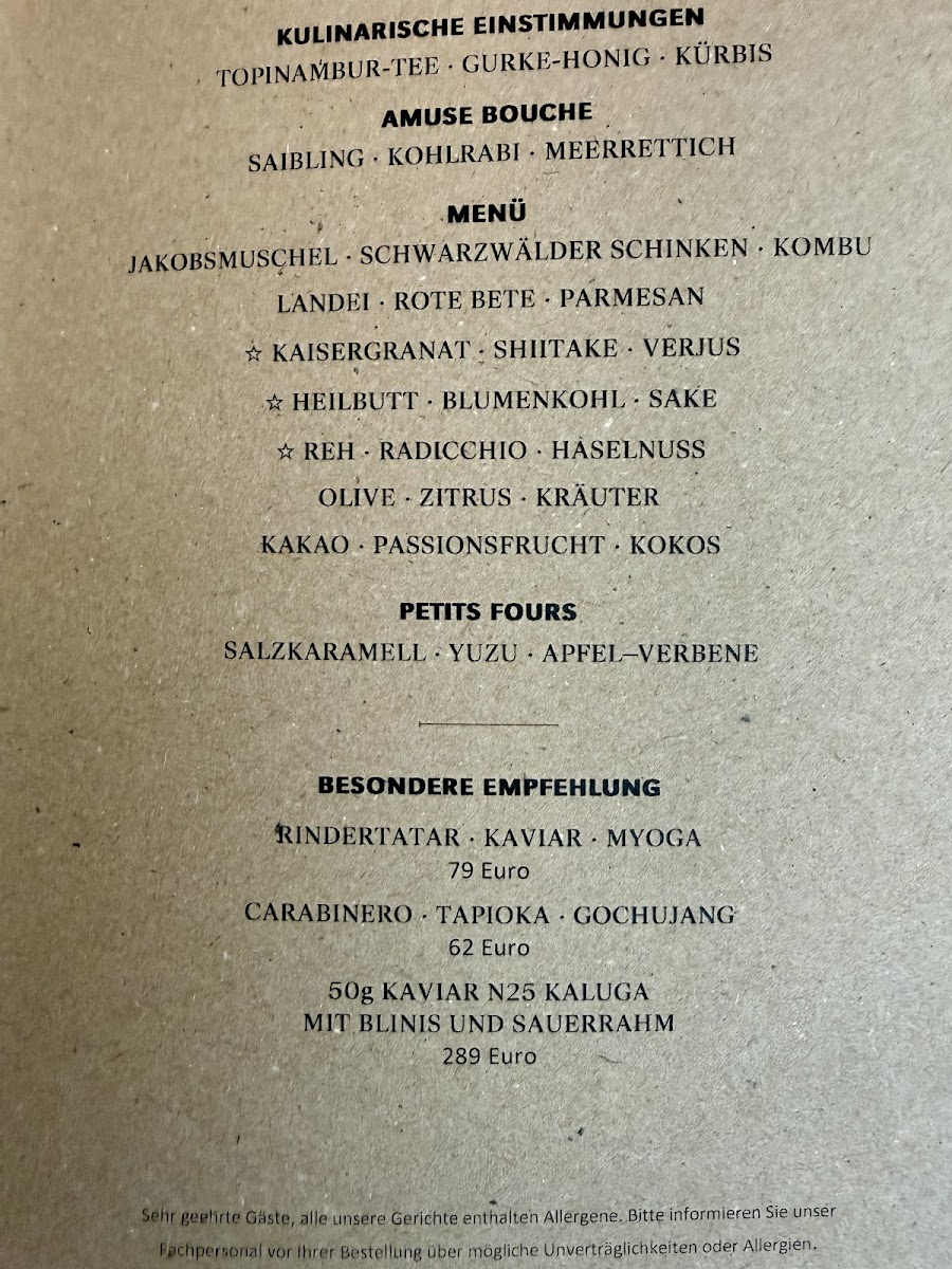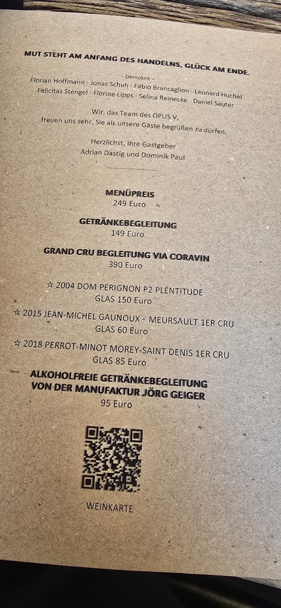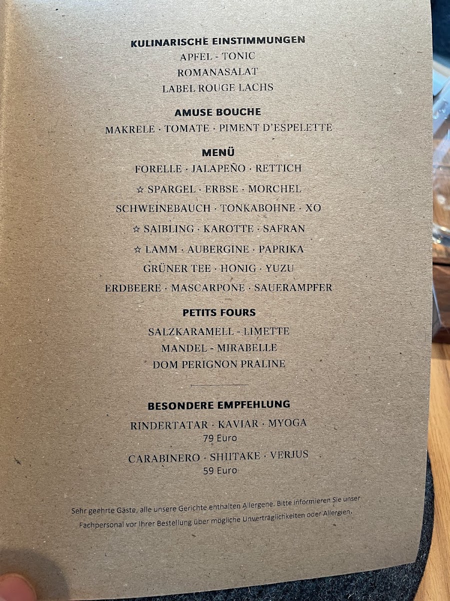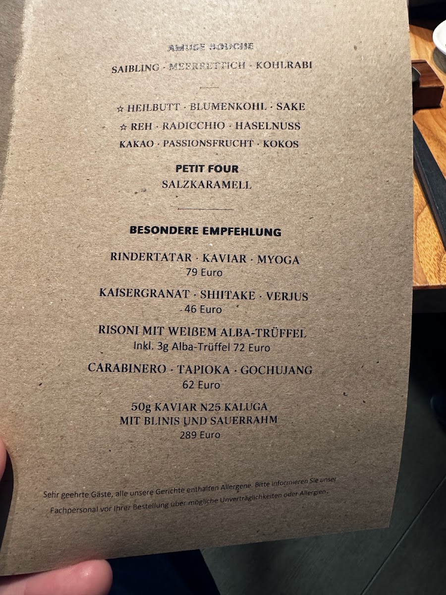 Opus V offers a refined and innovative menu that showcases the skillful blending of flavors and textures, providing a memorable culinary experience. The standout dish of Duck Breast is cooked to perfection, offering a rich and tender texture, complemented by the sharpness of its accompaniments. A creative start to the meal is the Amuse Bouche Taschenkrebs Ponzu Sake, a refreshing bite that balances the sweetness of the crab with the tang of ponzu and sake. For those with a preference for seafood, the Jakobsmuschel Kohlrabi Koriander is a must-try, where the delicate sweetness of the scallops is perfectly paired with the earthy flavors of kohlrabi and a hint of coriander. The Pork Belly and Bries Trüffel Vin Jaune deliver indulgent flavors; the crispy pork belly contrasts beautifully with the silky richness of the truffle-infused cheese. The Koberind stands out as a meat dish, with the succulent beef offering deep, satisfying flavors. An elegant touch of Caviar adds luxury to any course, and the Blumenkohl provides a harmonious balance with its creamy, earthy flavors. The Fisch Gehörte Zum Menü rounds out the meal, offering a delicate fish dish that highlights the freshness and finesse typical of the restaurant. Each dish is thoughtfully executed, making Opus V a destination for those seeking sophisticated flavors in a contemporary setting.